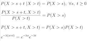 Distributions give us a much better sense than the average because, just as with incomes, life spans needn’t be distributed like a bell-shaped curve. They can be skewed towards one end or the other.In the case of empires, their life spans seem to follow what’s called an exponential distribution. The exponential distribution is special for a particular reason: Of all the different types of probability distribution, it is the only one that is “memoryless.” This means that if something’s life span adheres to an exponential distribution, the likelihood of it ending next year - or even tomorrow - is the same no matter how long it has lasted. It has no “memory.” If something has lasted for a hundred years, it is no more or less likely to go extinct next year than something that has only lasted a single decade. This is quite unlike, for example, human life span, where the older you get, the more likely you are to die. An empire’s chance of death is the same each year.Right you areExponential distribution is truly memoryless.First eqn above states the conditions for such a distribution, second is after applying the conditional rule, third is simply rearranging it. The only way Eq #3 can work is with an exponential distribution as seen in Eqn #4. So average time at a bank is 10 mins, what is the prob of waiting 15 mins? $exp^{-151/10} = 0.223$. What is the prob of waiting 15 minutes given you waited 10 minutes? It dont matter how long you waited, you simply take remaining 5 mins and ax the distribution, $exp^{-51/10} = 0.60$.