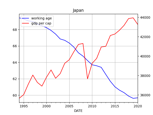 I did some data wrangling below, for US, JP, Oz. I fetched working age population, total population, and GDP; then I plot working age pop ratio, against GDP per capita.