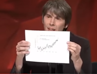 Physicist Brian Cox debating with a climate change denier showing two graphs. The first is global temperature levels, for last 100 years,