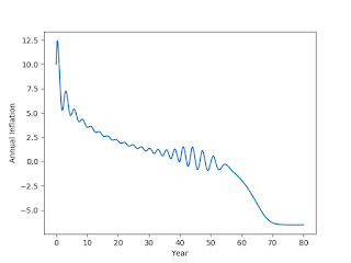 Here is the extended model (see bottom of same doc) with price levels / inflation. This one demonstrates the "the great moderation" followed by ka-boom. Here is the money shot,
