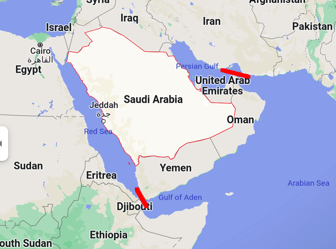 Saudi Arabia is an 'inner' country. They got'em locked in good, behind Yemen, Oman, and UAE with a few tiny access points to the high seas, which can be blocked with ease.