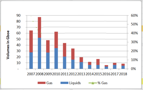 New oil and gas discoveries per year (billion barrels of oil equivalent). Discoveries have been falling in a big way since 2008.