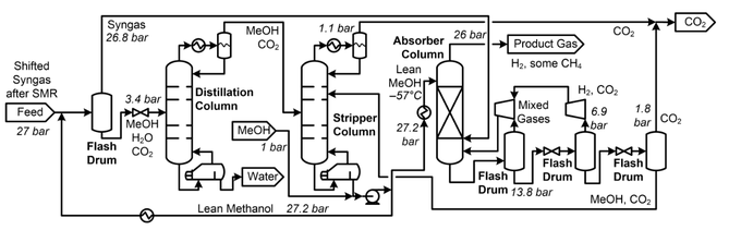 "[T]hrough gasification (H2 + CO), then water gas shift (H2O + CO --> H2 + CO2) so then what you have at the end is H2 + CO2. You can either capture the CO2 with an amine leaving H2 with some CO2 in it, or you use pressure swing adsorption to capture H2 at high purity, leaving CO2 with H2 in it"