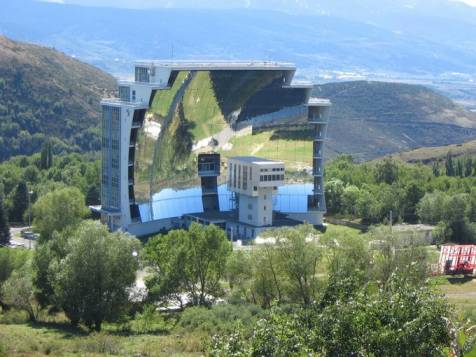 Wiki: "The solar furnace of Uzbekistan was built in 1981, and is located 45 kilometers away from Tashkent city. The furnace is the largest in Asia. It uses a curved mirror, or an array of mirrors, acting as a parabolic reflector, which can reach temperatures of up to 3,000 degrees Celsius. The place for the solar furnace of Uzbekistan was chosen carefully, because the sun shines there for 270 days a year"