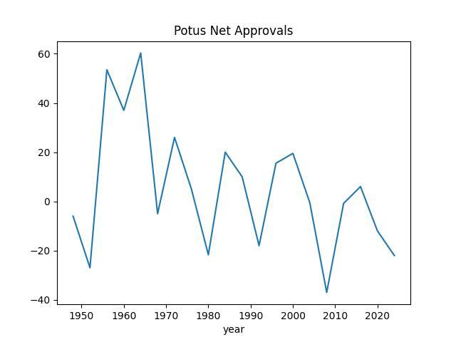 Incumb. president's net approval on the election year.. Looking at it since 1950s it forms a strange zigzag pattern.. but the trend seems to be down, presidents get less popular as time goes on - because what needs to get done ain't getting done.